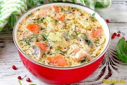 Благоуханный сырный суп с шампиньонами, картофелем и форелью.